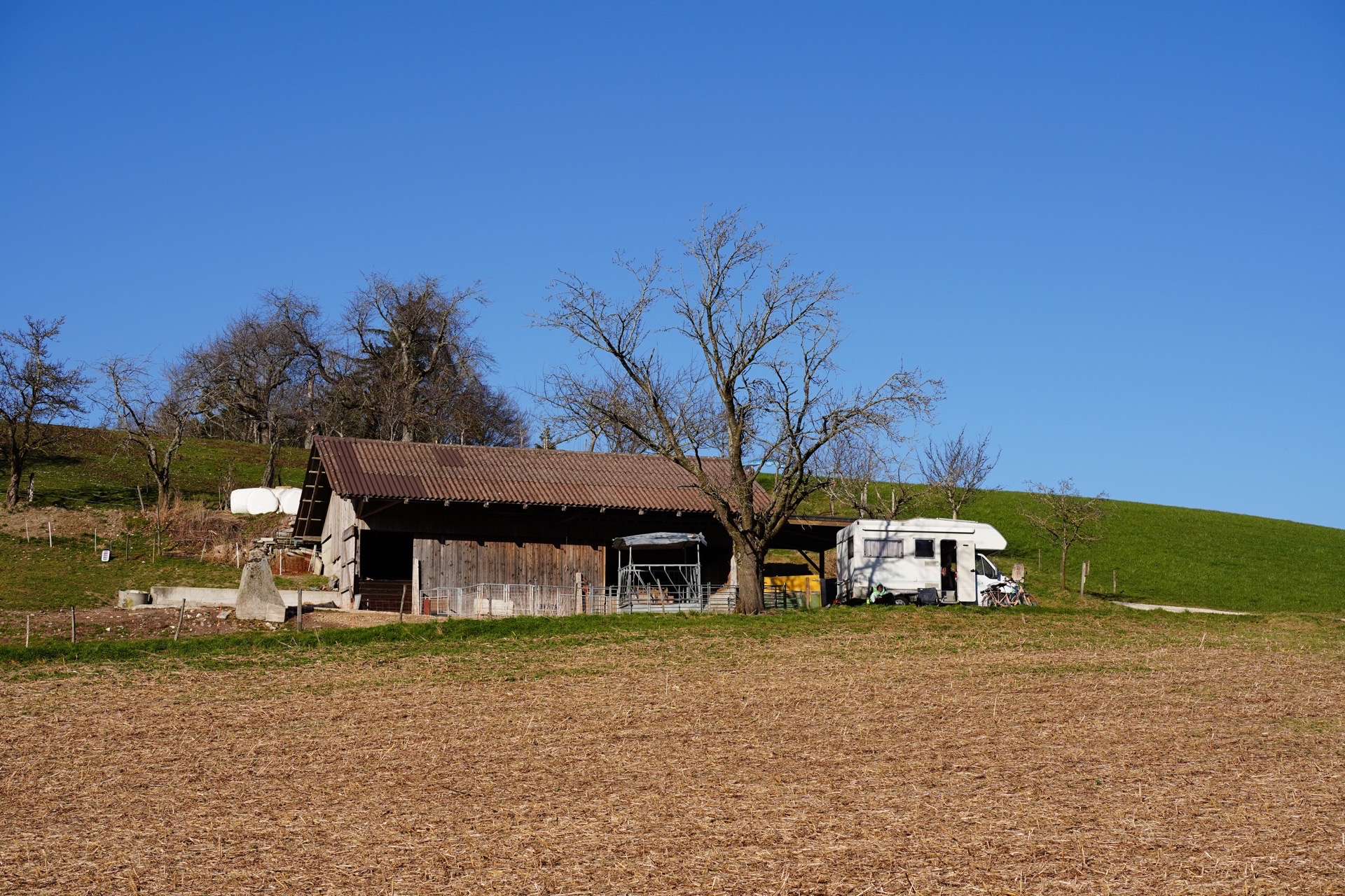 Wunderschöner Stellplatz in der Natur neben dem Schafstall – die Schafe sind perfekte, stille Nachbarn.