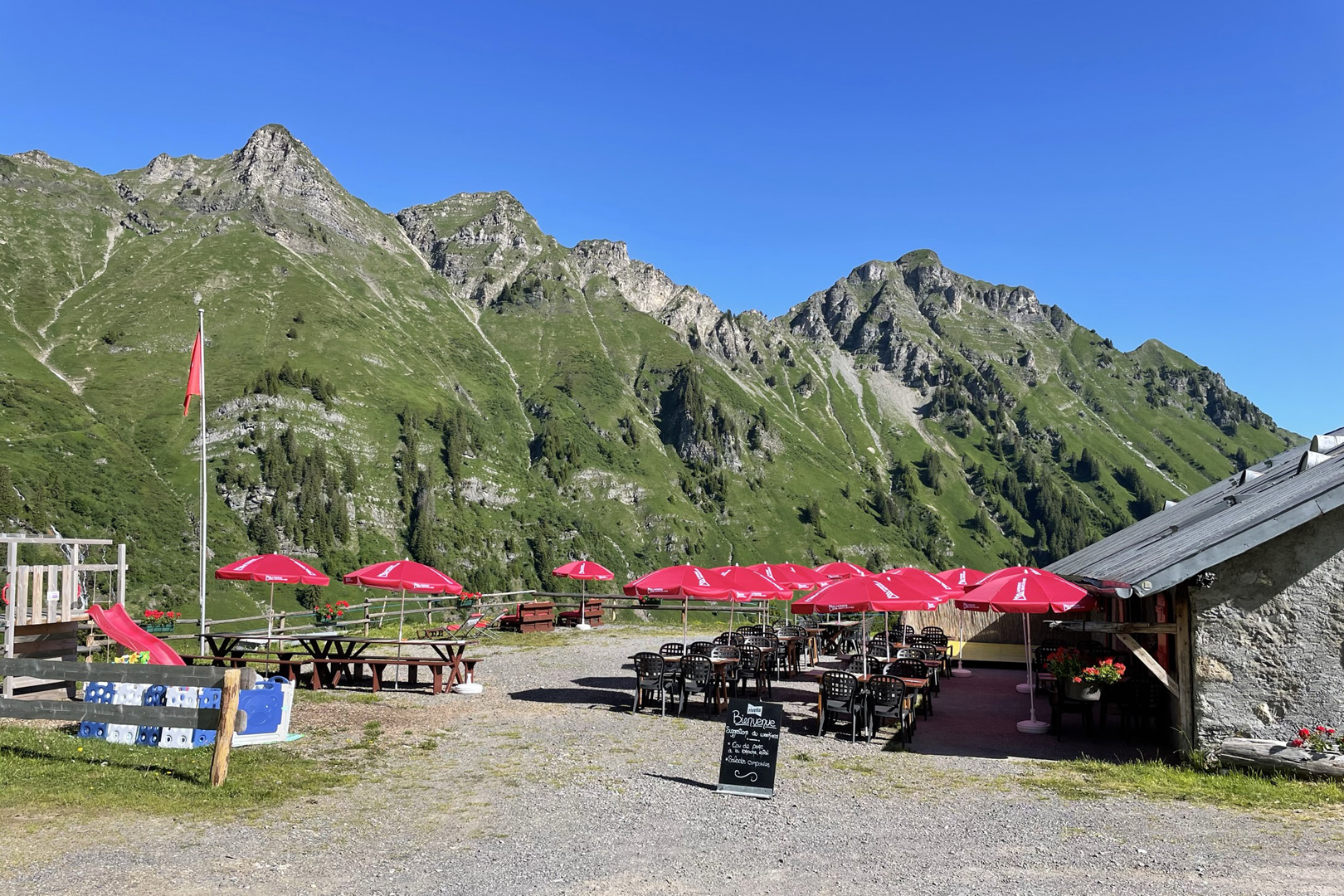 Une équipe très dynamique nous a accueillis dans ce restaurant d’alpage. Ambiance chaleureuse. Concert de musique traditionnelle tous les dimanches. Ils fabriquent leur fromage à raclette. Il faut la commander la veille si vous souhaitez en déguster au restaurant . On se gare sur leur parking qui a une très jolie vue et l’on profite des cloches des vaches.